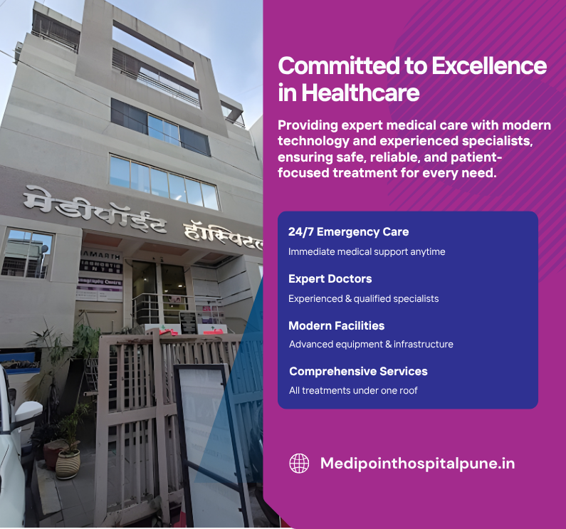 Medipoint Hospital is a leading multi-specialty hospital in Pune, dedicated to providing advanced, affordable, and patient-focused healthcare. Equipped with modern technology and expert doctors, we specialize in women’s health, maternity care, diagnostics, and minimally invasive treatments. Our goal is to deliver safe, personalized care with compassion, ensuring the best outcomes for every patient.